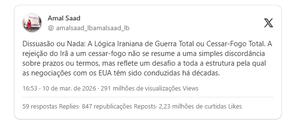 É aqui que a análise de Amal Saad capta a lógica com clareza: dissuasão ou nada; guerra total ou cessar-fogo total.