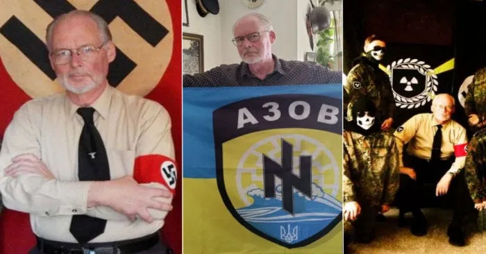 James Mason, também um pedófilo condenado, posa em frente à bandeira do Batalhão Azov ucraniano, ao lado de membros muito mais jovens da Atomwaffen.